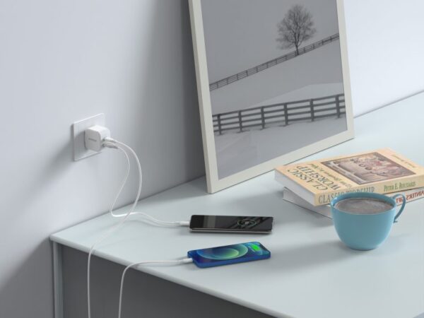 Cốc sạc có hai cổng sạc tiện lợi, bao gồm một cổng USB-C và một cổng USB-A. Cả hai cổng đều được bố trí hợp lý để đảm bảo người dùng có thể sử dụng đồng thời mà không gặp khó khăn. Bề mặt được hoàn thiện từ chất liệu nhựa cao cấp, mang lại độ bền bỉ và khả năng chống va đập tốt. Đèn LED tích hợp giúp thông báo tình trạng sạc một cách trực quan, tạo sự tiện lợi khi sử dụng trong môi trường thiếu sáng.