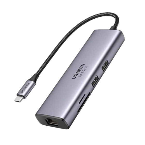 Hub chuyển đổi Type-C Ugreen 7 in 1 CM512 60515 là phụ kiện hữu ích cho người dùng laptop USB-C cần mở rộng cổng kết nối. Thiết bị tích hợp HDMI 4K, LAN Gigabit, USB 3.0, SD/TF và sạc PD 100W trong một thiết kế nhỏ gọn.