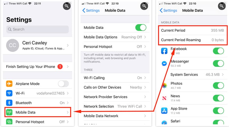 Truy cập Settings (Cài đặt) > Mobile data (Dữ liệu di động) để xem lượng dữ liệu di động bạn đã sử dụng trong Current Period (Giai đoạn hiện tại). Ngoài ra còn có tổng số Current Period Roaming (Chuyển vùng Giai đoạn Hiện tại)