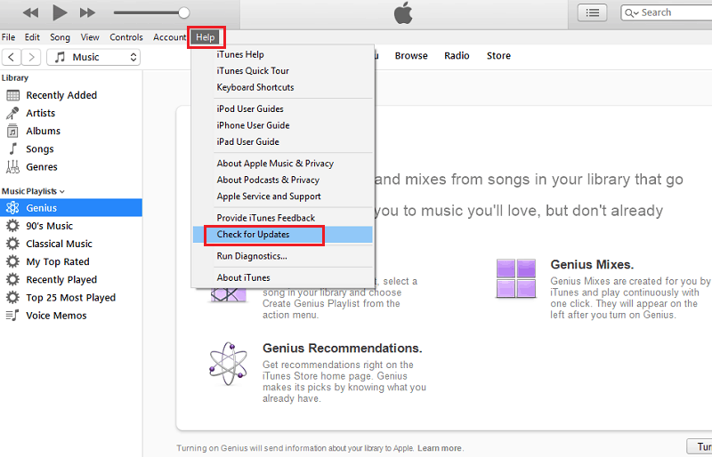 Bước 1: mở iTunes phiên bản mới nhất trên máy tính. Nếu trước đây bạn đã cài đặt iTunes rồi thì chọn Help > Check for Updates để nâng cấp lên.
