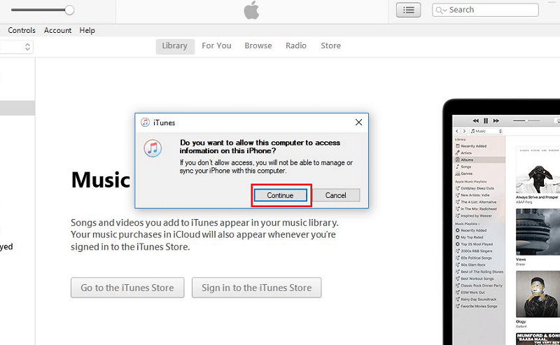 Bước 2: Kết nối iPhone với iTunes trên máy tính thông qua cáp USB, sau đó chọn "Tin cậy" trên điện thoại. Trên máy tính bạn chọn "Continue".