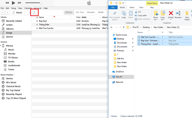 Bước 4: Tiến hành chọn Songs > copy nhạc bạn muốn vào mục > chọn biểu tượng iPhone như hình.