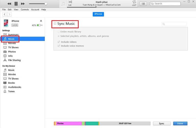 Bước 6: Chọn > Settings > Music rồi tích Sync Music để đồng bộ các bài hát.