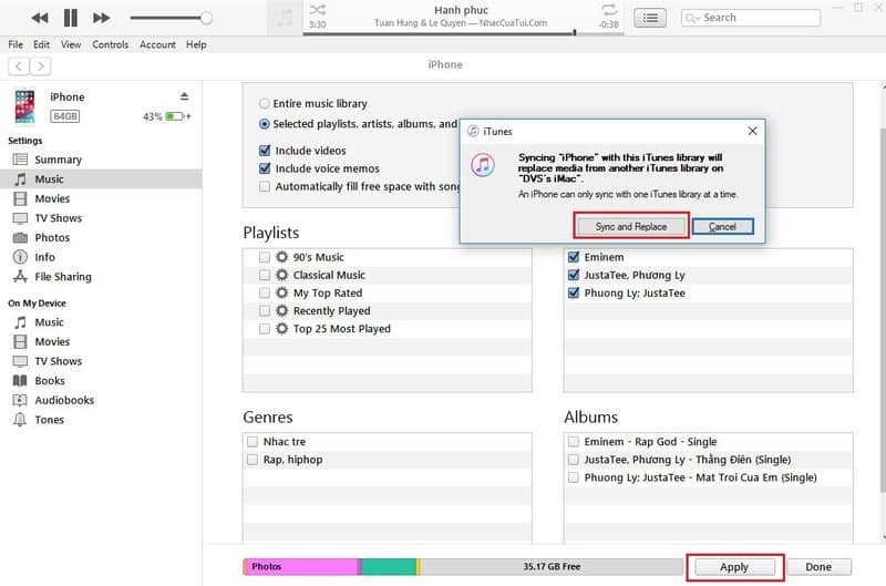 Bước 7: Chọn album hay bài hát bạn muốn đồng bộ > Sync and Peplace.