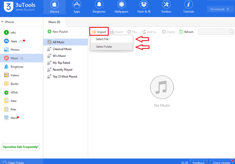 Bước 4: Chọn Import để thực hiện việc nhập dữ liệu nhạc vào iPhone, hoặc chọn Select File để chọn từng bài hát/ Select Folder để chọn toàn bộ nhạc trong một thư mục.