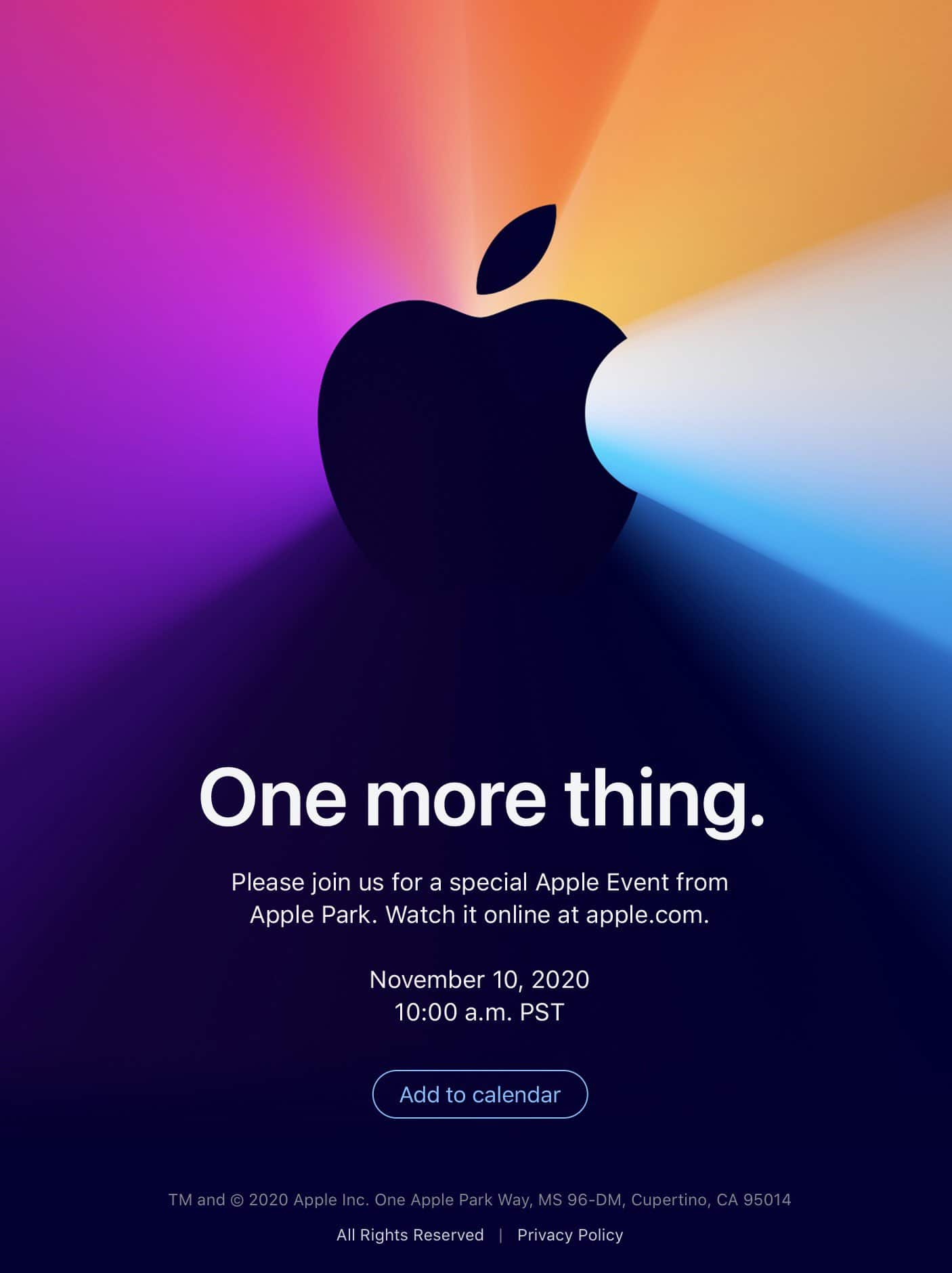 Khẩu hiệu của lời mời tham gia sự kiện từ Apple có nội dung “One More Thing” có thể đề cập đến các máy Mac Silicon mới của Apple. Đây sẽ là sự kiện thứ ba của Apple trong năm nay. Giống như tất cả các sự kiện khác của Apple được tổ chức trong năm nay, sự kiện ngày 10 tháng 11 cũng sẽ được phát trực tiếp từ Apple Park. Sự kiện này dự kiến được phát trực tiếp từ 10:00 sáng theo giờ PST. Apple đã xác nhận tại WWDC 2020 năm nay rằng họ sẽ ra mắt Apple Silicon Macs trước cuối năm nay.