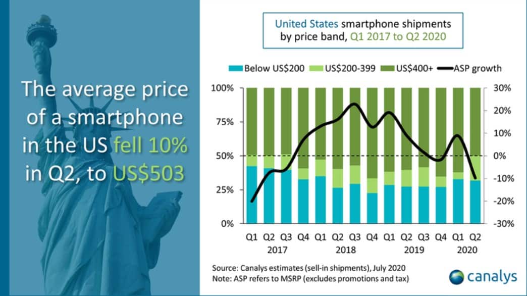 Cứ 10 điện thoại được bán ra thì có tới 7 thiết bị đến từ Apple và Samsung. Giá trung bình của một chiếc điện thoại thông minh ở Mỹ giảm 10% so với năm ngoái, xuống còn 503 USD. Canalys nhận thấy rằng các nhà phân phối đang gia tăng đơn đặt hàng đối với điện thoại thông minh Android giá rẻ từ các thương hiệu ít tên tuổi hơn, chẳng hạn như Unimax và Wiko. Google và các thương hiệu Android khác đang tăng cường tiếp cận phân khúc giá rẻ và tầm trung, và ngoài sự thành công của iPhone SE, có vẻ như phân khúc dưới 400 USD đang sẵn sàng để nổi bật hơn.