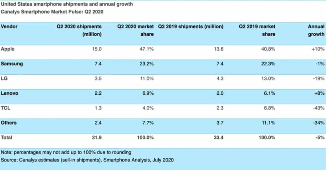 Các nhà cung cấp đã xuất xưởng tổng cộng 31.9 triệu điện thoại thông minh tại Hoa Kỳ. Con số này thể hiện mức giảm 5% so với cùng kỳ năm ngoái, nhưng tăng 11% so với quý trước. Việc mở cửa trở lại các cơ sở sản xuất ở Trung Quốc vào cuối tháng 3 và các cửa hàng bán lẻ mở cửa trở lại vào tháng 5 và tháng 6 là những yếu tố chính đóng góp vào tăng trưởng. Khoảng 70% điện thoại thông minh xuất xưởng tại Mỹ trong quý 2 năm 2020 được sản xuất tại Trung Quốc, tăng 60% so với quý trước.