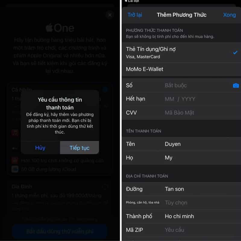 Bước 4: Kiểm tra thông tin tài khoản và phí sử dụng chính xác bạn xác nhận và nhập "Yêu cầu thông tin thanh toán", bạn bắt buộc phải nhập đúng và đầy đủ thông tin này, để Apple có cơ sở thanh toán tiền vào tháng tiếp theo khi bạn sử dụng chính thức nha.