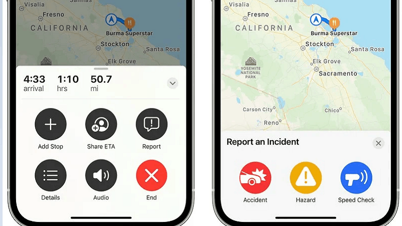 iOS 14.5 bao gồm tính năng báo cáo tai nạn, nguy hiểm và kiểm tra tốc độ dọc theo một tuyến đường trong bản đồ khi chỉ đường nhờ vào một nút "Report" mới trong ứng dụng Apple Maps. Nó được thiết lập cho phép bạn nhấn để thông báo tai nạn, nguy hiểm hoặc bẫy tốc độ tại vị trí của bạn trong ứng dụng Apple Maps. Được biết, đây là một tính năng do ứng dụng bản đồ Waze cung cấp và được trang bị sẵn trên iPhone và trong CarPlay.