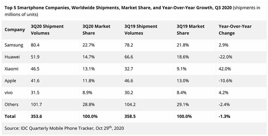 Tổng cộng, các nhà sản xuất điện thoại đã xuất xưởng khoảng 353.6 triệu chiếc điện thoại thông minh trong quý 3, giảm 1.3% so với cùng kỳ năm ngoái. Kết quả tốt hơn so với dự báo ban đầu của IDC, giảm khoảng 9% do đại dịch Coronavirus .