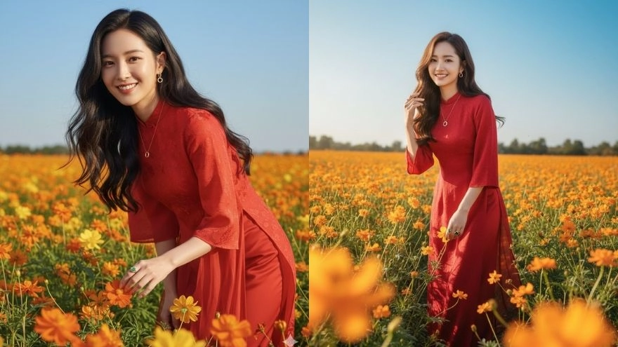 Ultra-realistic cinematic portrait of a young adult Viet Nam woman with long wavy dark brown-black hair, smiling radiantly while looking directly at the viewer. Outfit: elegant red silk traditional-style Ao Dai. Accessories: thin gold necklace with O-shaped pendant, matching gold O-shaped earrings, gold ring with a small moss-green gemstone. Scene: colorful flower field filled with vibrant orange and yellow blossoms and lush green leaves under a clear blue sky. Lighting: soft golden hour backlight creating rim light around her hair and skin, warm natural sunlight. Mood: romantic, poetic, warm and dreamy atmosphere. Quality: ultra-detailed, 8K cinematic realism. Shot 1 – Close-up: Camera: tight close-up on her face at low angle. Pose & Action: gently brushing a strand of hair behind her ear while smiling softly, sunlight glowing through her wavy hair. Shot 2 – Medium shot: Camera: waist-up framing, shallow depth of field. Pose & Action: slightly bending forward, fingertips grazing flower petals, natural breeze moving her dress fabric. Shot 3 – Full body shot: Camera: low-angle full-body cinematic shot. Pose & Action: standing gracefully among tall flowers, dress flowing lightly as she takes a small step forward. Shot 4 – Rear shot: Camera: over-the-shoulder rear angle. Pose & Action: turning her head back toward the viewer with a soft smile, flowers blurred in foreground creating depth. Shot 5 – Dramatic low-angle wide shot: Camera: wide lens low to the ground, flowers dominating foreground. Pose & Action: gently walking through the field, hand lightly touching blossoms, golden rim light outlining her silhouette.