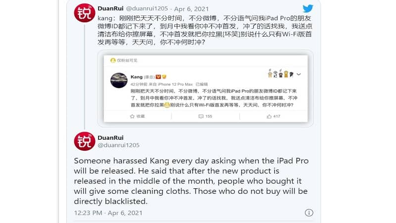 Leaker DuanRui đã chia sẻ bình luận của Kang từ Weibo trên Twitter: