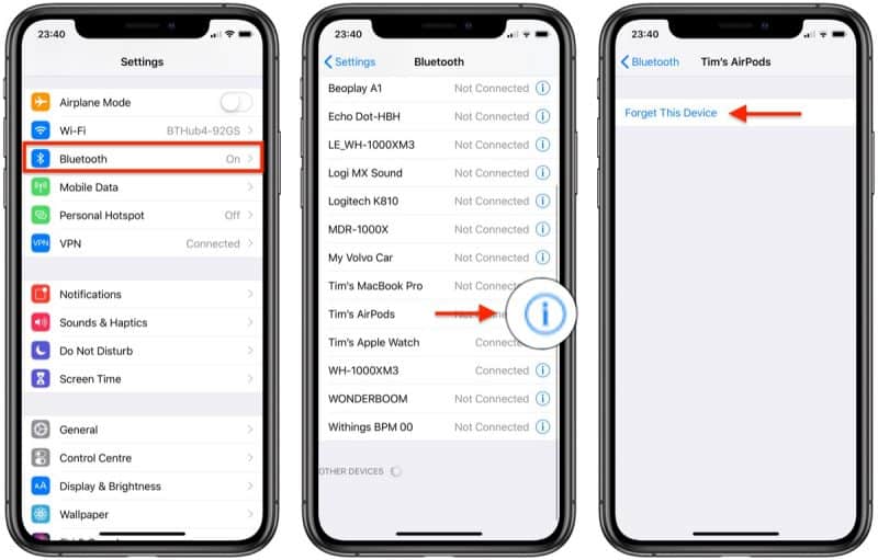 - Bước 1: Vào Cài đặt >> Bluetooth và sau đó nhấn biểu tượng “i” bên cạnh AirPods của bạn trong.