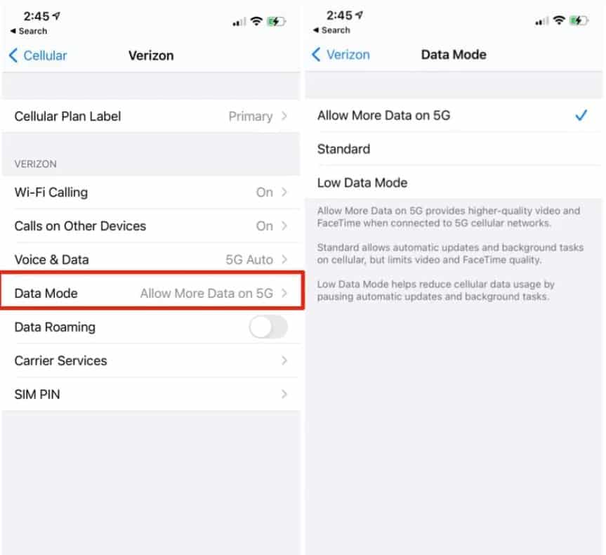 Có một số chế độ dữ liệu mà bạn có thể điều chỉnh. Theo mặc định, các mẫu iPhone 12 được đặt ở chế độ "Cho phép thêm dữ liệu trên 5G", cung cấp video và FaceTime chất lượng cao hơn khi được kết nối với mạng di động 5G.