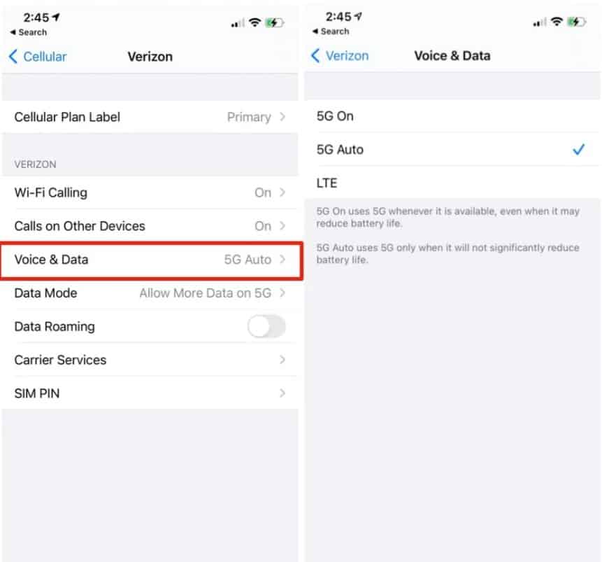 - LTE. 5G Auto là Chế độ tiết kiệm dữ liệu của Apple nhằm hoán đổi kết nối của iPhone sang LTE khi tốc độ 5G không cần thiết. Ví dụ: khi iPhone đang cập nhật trong nền, nó sử dụng LTE vì tốc độ siêu nhanh là không cần thiết, nhưng trong những trường hợp tốc độ quan trọng, chẳng hạn như tải xuống một chương trình, các mẫu iPhone 12 sẽ chuyển sang 5G.