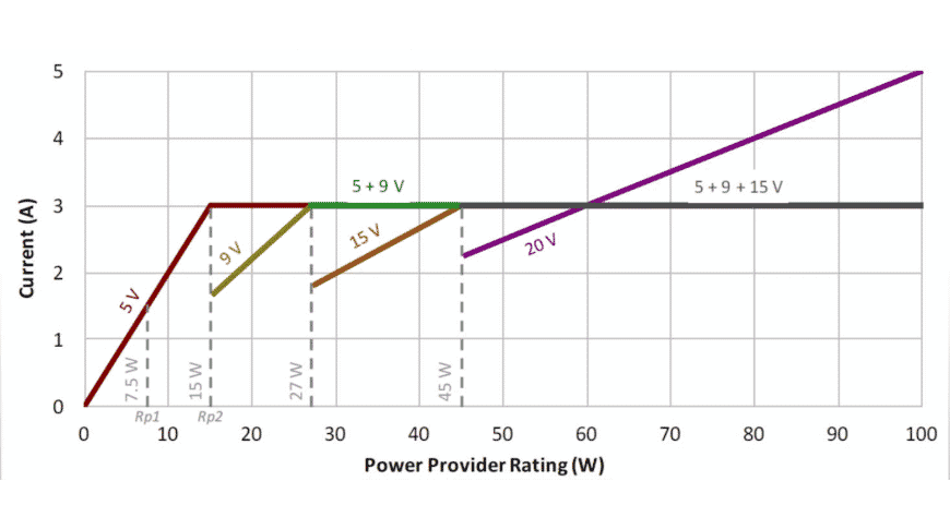 Thông số kỹ thuật PD 3.0 bao gồm các yêu cầu cụ thể đối với các đường dây điện áp có sẵn cho một định mức công suất nhất định. Bất kỳ bộ chuyển đổi nào trên 7.5W sẽ chỉ có điện áp 5V, trong khi công suất lớn hơn 15W sẽ sử dụng cả 5V và 9V.