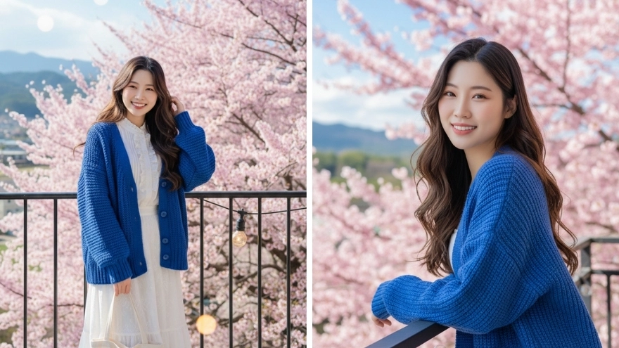 Use 100% my uploaded face as the identity reference, keeping the face natural and realistic with correct proportions and skin texture.. A beautiful young East Asian woman with long flowing wavy brown hair, a gentle smile, wearing an oversized chunky knit bright blue cardigan, a white ruffled blouse, and a long textured white skirt, holding a white tote bag, standing on an outdoor balcony with a black railing, one hand gracefully touching her hair, the other resting on the railing, with a small decorative light bulb hanging nearby, background of abundant, vibrant pink cherry blossom trees in full bloom, framing her against a bright blue sky with soft clouds, overlooking a scenic valley with distant houses and mountains, photorealistic, hyperrealistic, highly detailed, 8k, ultra HD, natural daylight, soft cinematic lighting, shallow depth of field, bokeh, vibrant colors, clear focus.
