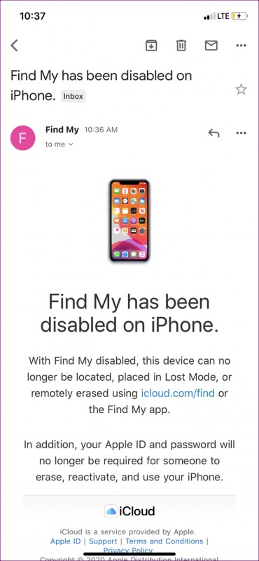 Ngay khi vừa đăng xuất Apple ID khỏi iPhone, bạn sẽ nhận được thông báo từ Apple với nội dung tính năng Find My đã bị vô hiệu hóa.