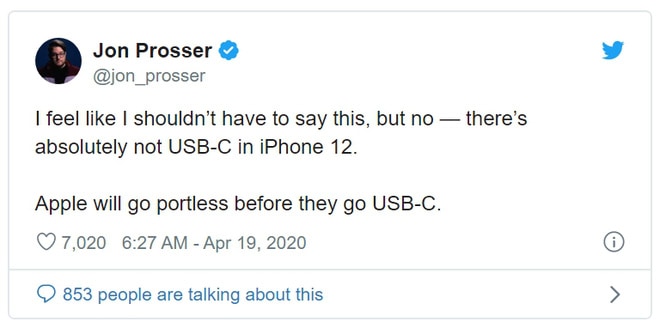Jon Prosser - một Leaker chuyên về Apple dượcd khá nhiều người biết đến, đã đăng tải một đoạn Tweet rằng "iPhone 12 chắc chắn sẽ không được trang bị cổng USB-C" và nếu điều đó diễn ra, thì iPhone 12 sẽ tiếp tục trung thành với công nghệ Lightning đã lỗi thời của Apple.
