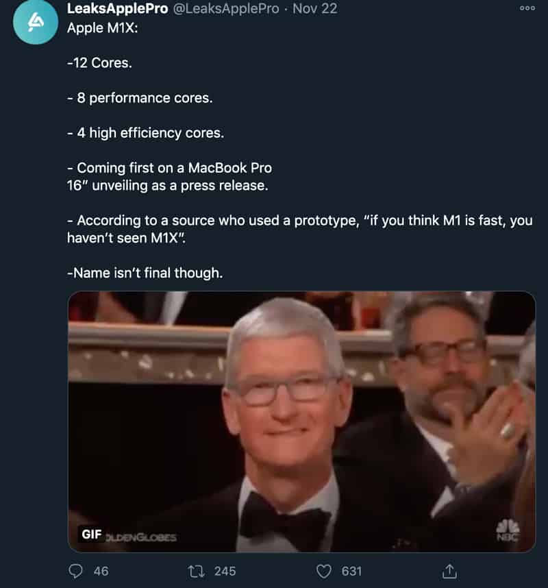 Theo @LeaksApplePro, M1X sẽ ra mắt trên MacBook Pro 16 inch vào năm sau, dự đây sẽ là chiến binh đại diện cho Macbook 2021 càn quét khắp các mặt trận laptop, đặc biệt là nếu nó thực sự nhanh hơn nhiều so với chip M1 trên MacBook Pro 13 inch.