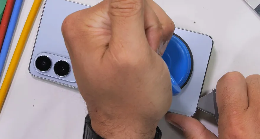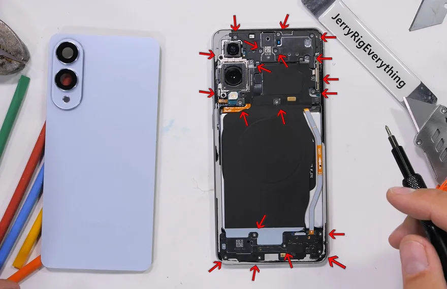 Việc mở Galaxy S25 Edge khá đơn giản. Mặt lưng sử dụng kính Gorilla Glass Victus 2 siêu mỏng, được gắn bằng keo chống nước. Chỉ cần làm nóng để làm mềm keo, dùng dao và cốc hút, bạn có thể tháo mặt lưng ra. Tuy nhiên, kính và khung titan sẽ rất nóng khi tháo, đòi hỏi sự kiên nhẫn và cẩn thận để tránh bỏng tay. Bên trong, máy trông quen thuộc, nhưng lớp nhựa bên trong mỏng hơn, với các khe hở cho linh kiện như màng loa dưới nhô lên.