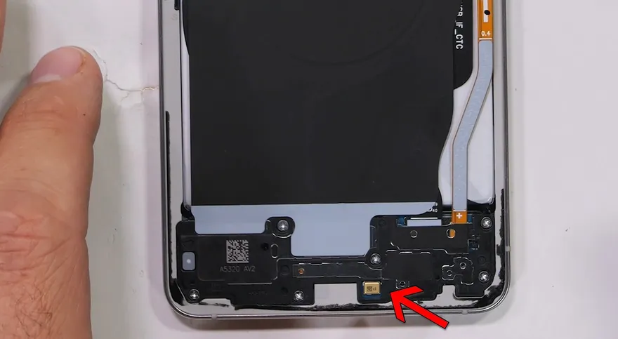 Galaxy S25 Edge gây ấn tượng với sự tối ưu hóa không gian. Sạc không dây hỗ trợ 15W, nhưng không có vòng nam châm định vị như iPhone. Dây đồng trong cuộn sạc thu hẹp dần về phía tâm, có lẽ để tối ưu hiệu suất. Các cáp ribbon cho pin, cổng sạc, màn hình và tín hiệu đều dùng đầu nối kiểu LEGO, giống như trên S25 Ultra, cho thấy Samsung tận dụng công nghệ hiện có, đảm bảo độ tin cậy và tiết kiệm chi phí. Loa stereo dưới mỏng hơn, nhưng vẫn có "bi" bên trong, nhìn thấy qua nắp thứ ba ở phía trên.