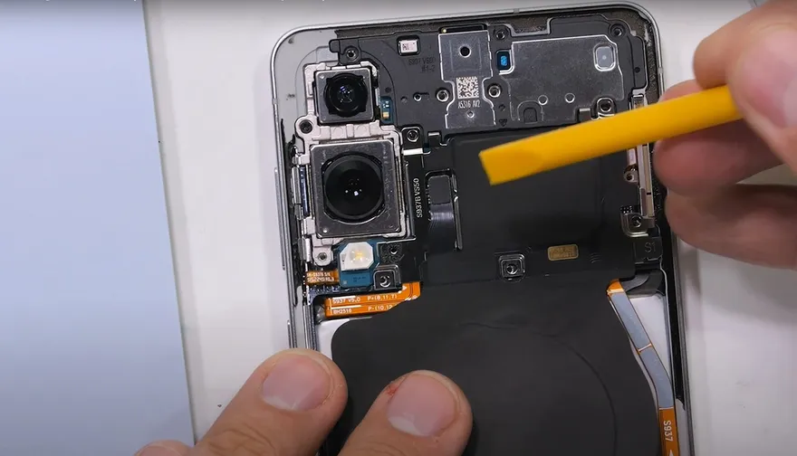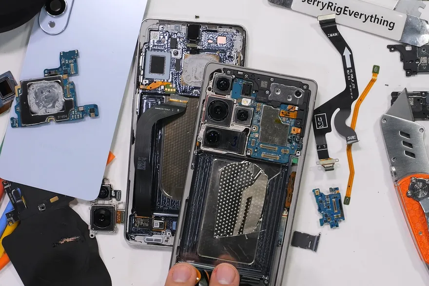 Khi tháo pin, ta thấy buồng hơi tản nhiệt rộng và phẳng, giúp làm mát bộ vi xử lý và pin khi sạc. So với S25 Ultra (dày hơn 2,4 mm), S25 Edge loại bỏ một phần khung nhôm giữa buồng hơi và chip, cho phép chip tiếp xúc trực tiếp qua keo tản nhiệt, cải thiện hiệu suất nhiệt. Bo mạch chủ của cả hai đều xếp chồng, nhưng lớp giữa của S25 Edge mỏng hơn đáng kể, giống như "phần kem" mỏng hơn trong bánh sandwich. Đây là nơi Samsung tiết kiệm được 2 mm độ dày, tạo nên thiết kế siêu mỏng.