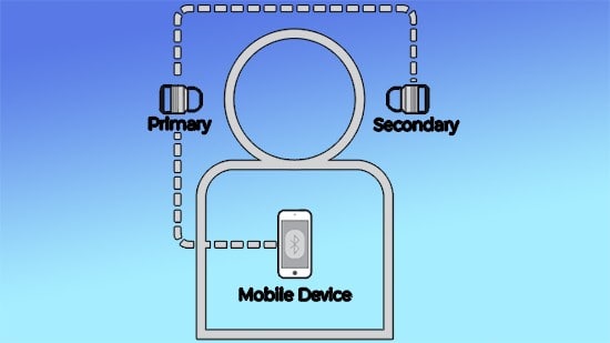 Sơ nét về công nghệ TWS: Âm thanh từ Mobile Device (thiết bị phát, nguồn phát) -> Tai nghe sơ cấp - Primary (tai nghe chính) -> Tai nghe thứ cấp - Secondary (tai nghe phụ).