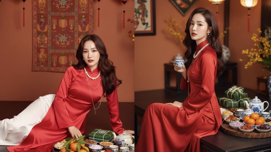 ![Prompt Gemini AI: Áo dài đỏ, hoa đào và mâm cổ chuẩn Tết]()