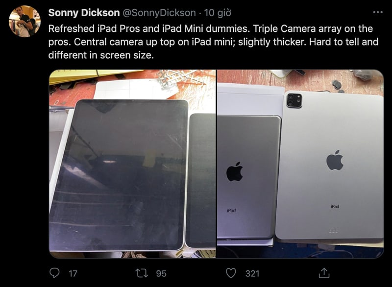 Hôm nay Sonny Dickson đã chia sẻ trên Twitter hình ảnh về mô hình của iPad Pro 11 inch, 12.9 inch và cả iPad mini 6 sắp được ra mắt. Hình ảnh của iPad Pro khá giống với những rò rỉ được chia sẻ trước đây với cụm camera được thiết kế lại với cảm biến LiDAR và màn hình LED mini