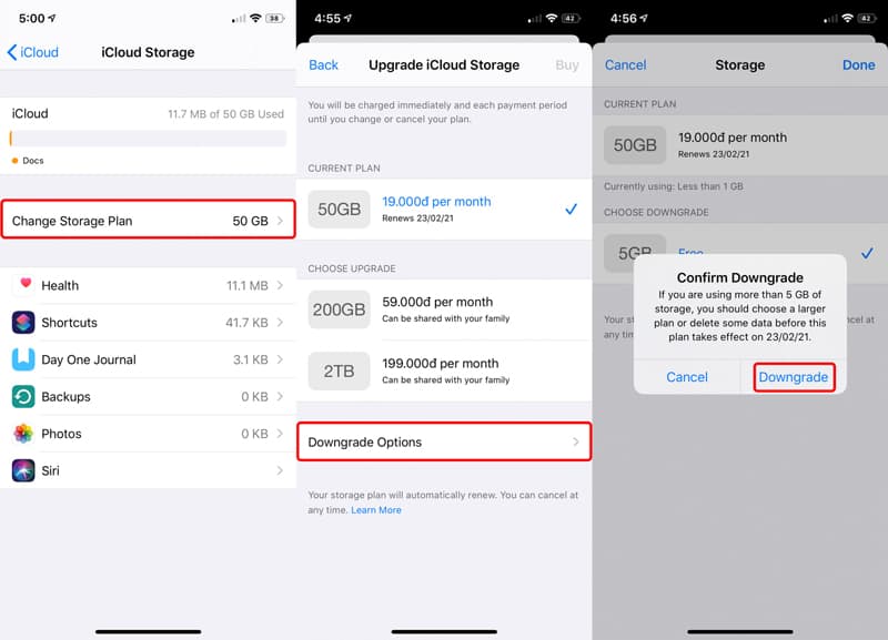 Truy cập Setttings (Cài đặt) > iCloud > iCloud Storage (Quản lý dung lượng) > Change Storage (Thay đổi gói dung lượng) > Dowgrade Options (Tuỳ chọn hạ cấp) và chọn gói 5GB mặc định. Hãy đảm bảo sao lưu dữ liệu của bạn trong iCloud để tránh mất mát dữ liệu sau khi hết thời hạn dùng miễn phí.