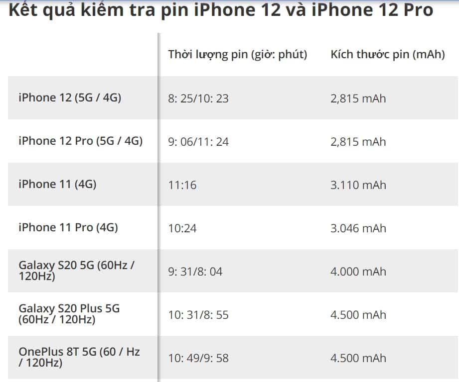 OnePlus 8T kéo dài lần lượt 10:49 ở màn hình 60Hz và 9:58 trên 120Hz, cả hai đều trên 5G. Trong khi đó Pixel 5 của Google tốt hơn iPhone 12 gần một giờ, khoảng 9:56 và giảm xuống còn 9:29 với màn hình được đặt ở tốc độ làm mới 90Hz nhanh hơn. Cả hai con số đó đều vượt xa kết quả 8:25 của iPhone 12 khi bật 5G.