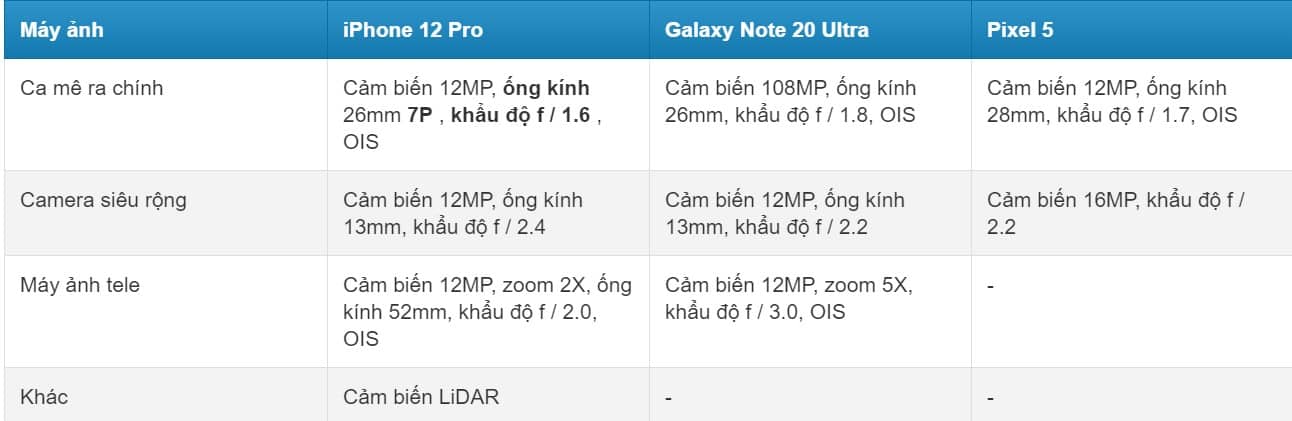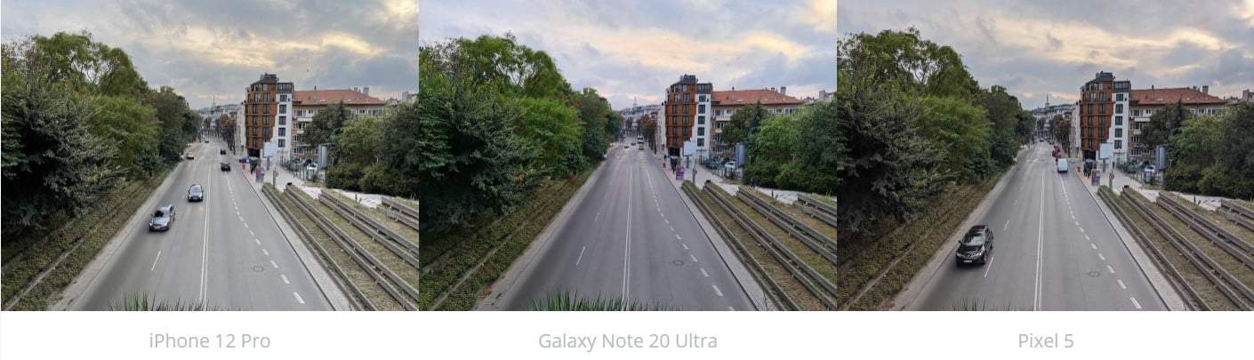 Có một số khác biệt về phần cứng giữa iPhone 12 Pro, Galaxy Note 20 Ultra và Pixel 5. Đầu tiên, iPhone và Samsung có camera chính 26mm, trong khi Pixel có ống kính 28mm, nói một cách đơn giản có nghĩa là ảnh chụp trên camera chính của Pixel sẽ không quá rộng.