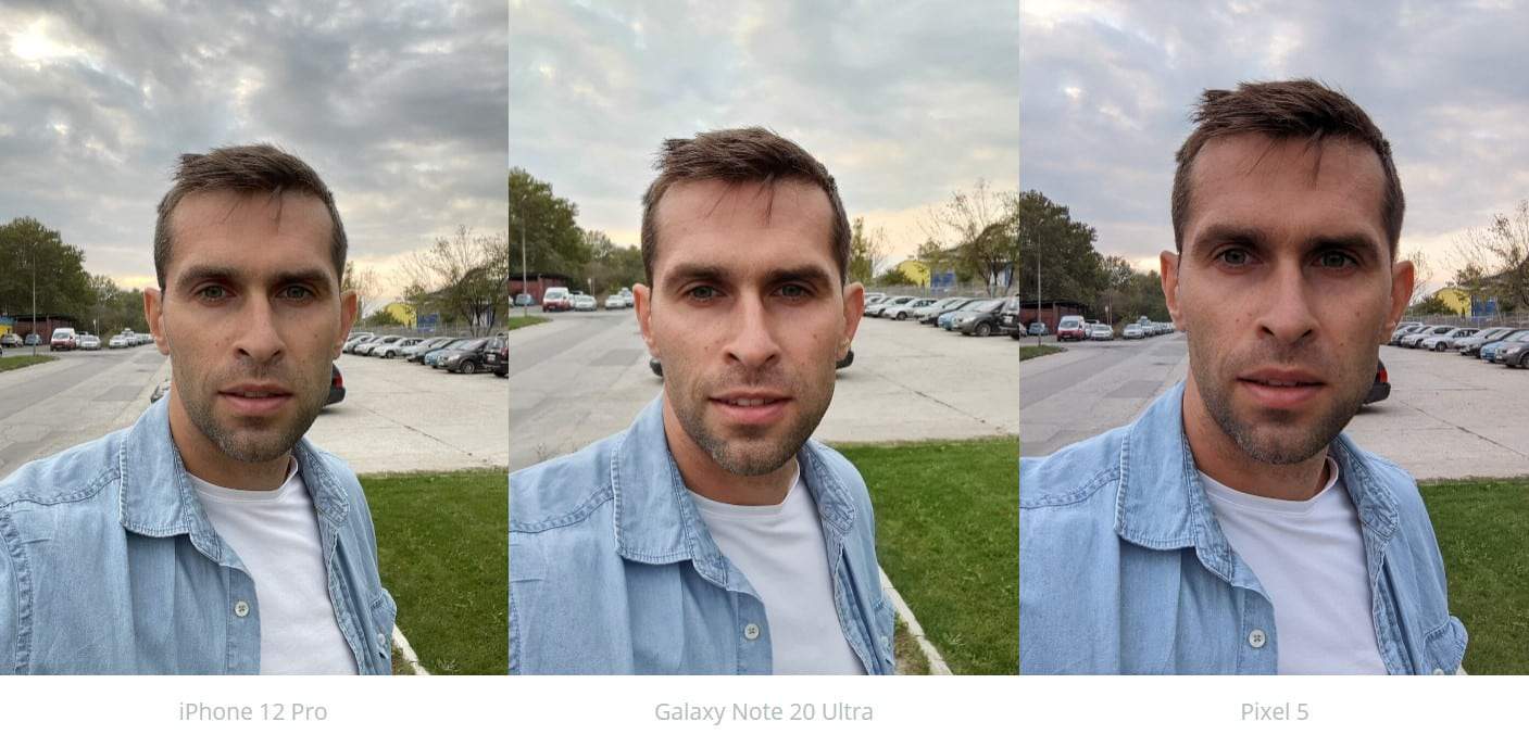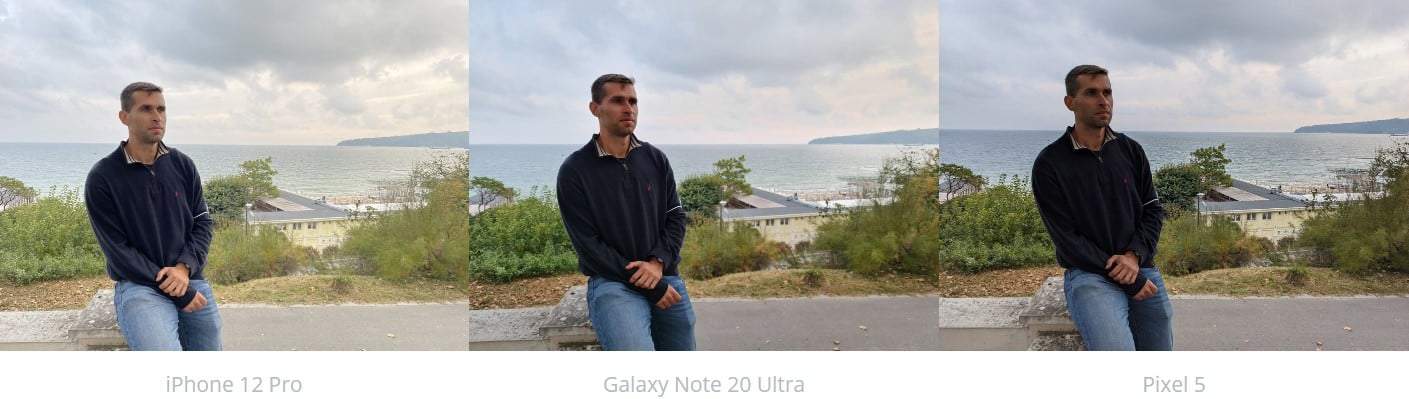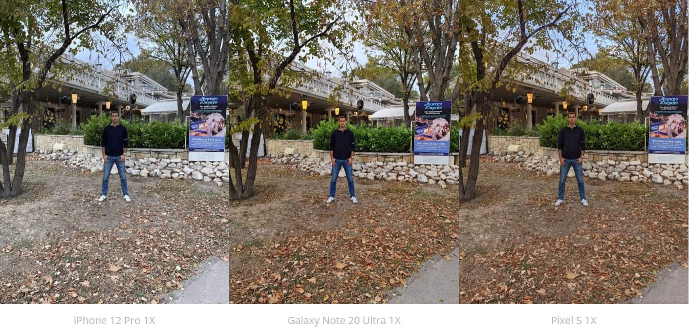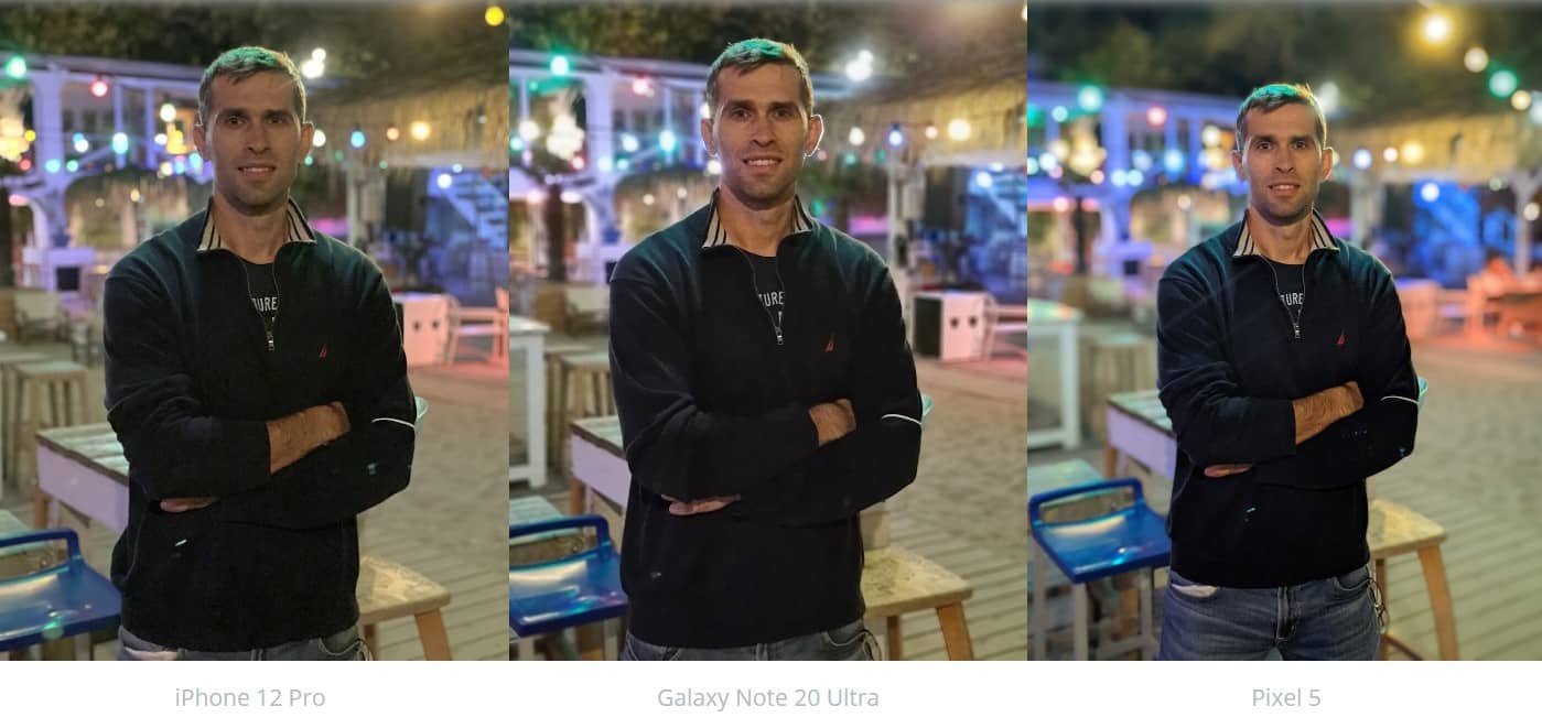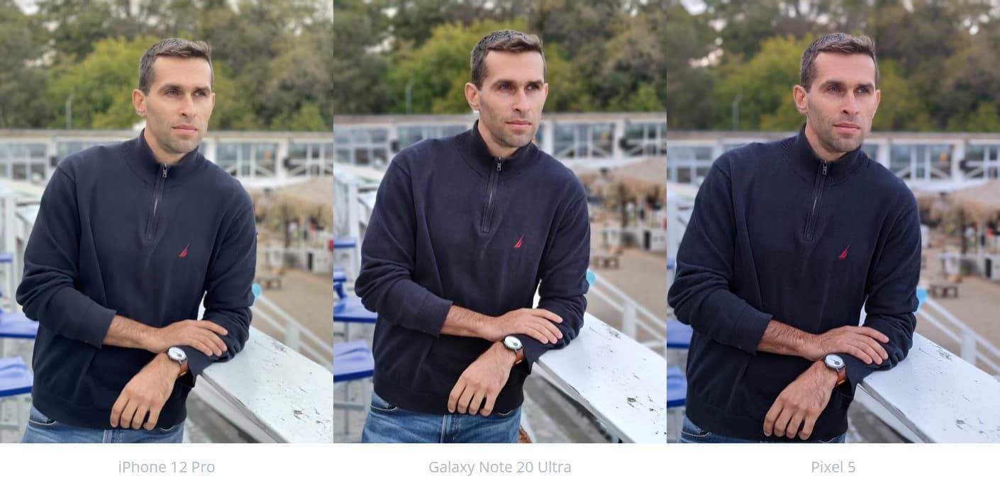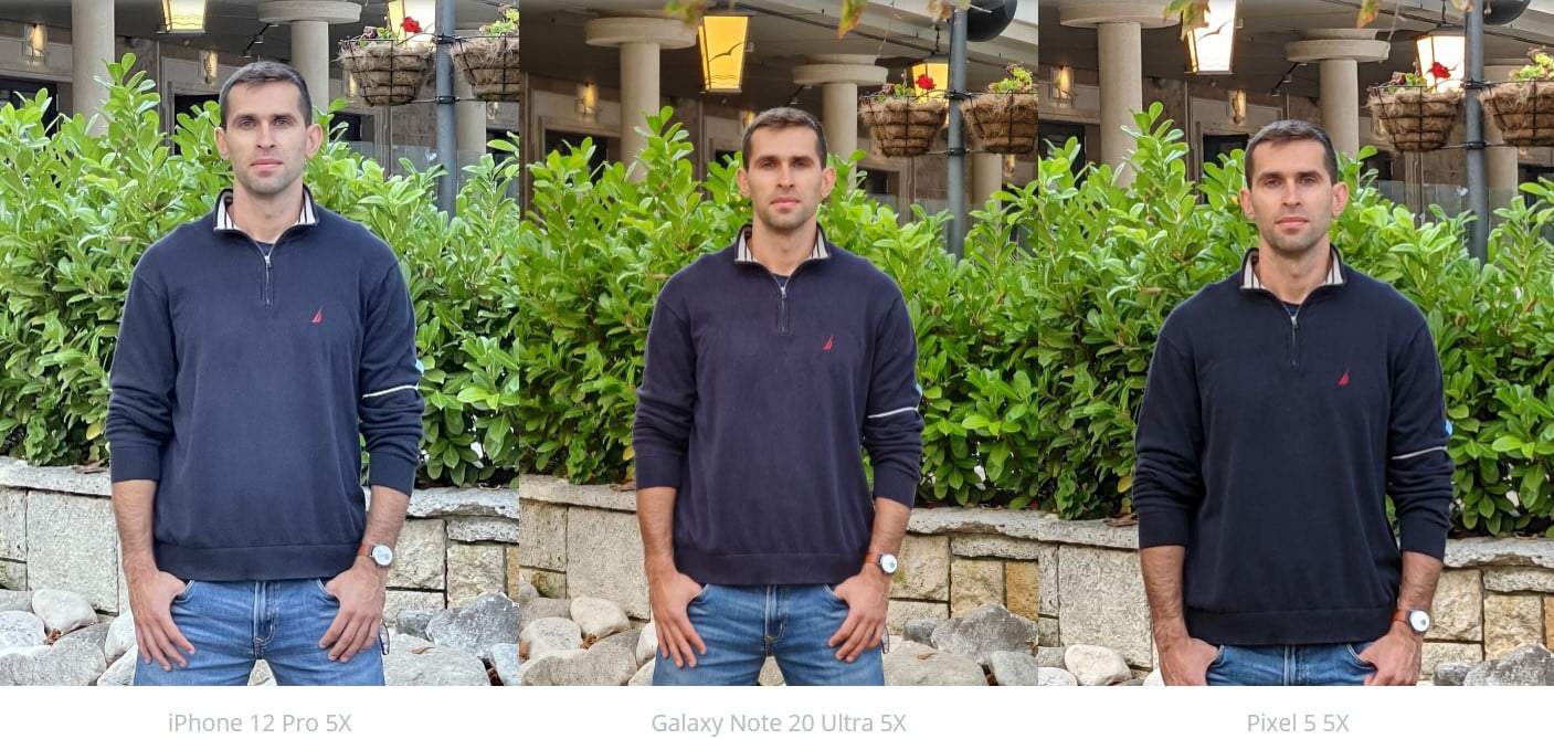 Bạn có thể dễ dàng nhận thấy xu hướng ám vàng quen thuộc trên bức ảnh của những chiếc iPhone. Điều đáng chú ý hơn cả ở đây là tông màu da: da trông giống màu của một quả bí ngô. Trong khi đó, Galaxy Note 20 Ultra dường như đạt được sự cân bằng tốt hơn vì ảnh chụp không bị dư sáng và độ tương phản tốt. Pixel 5 cho ra một bức ảnh quá tối.