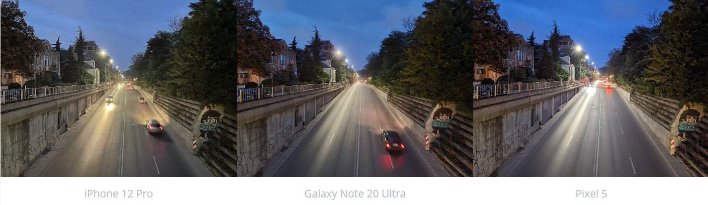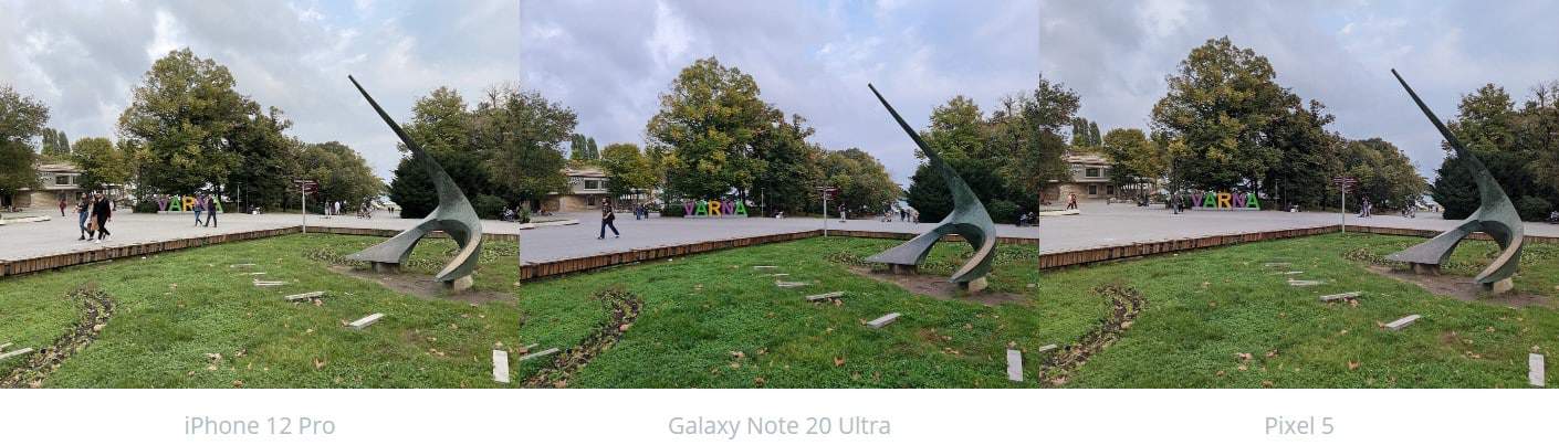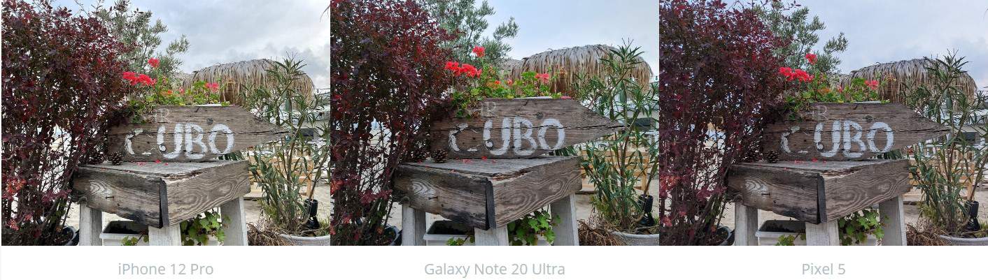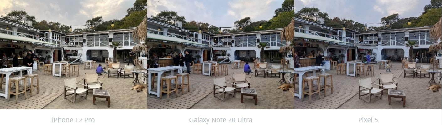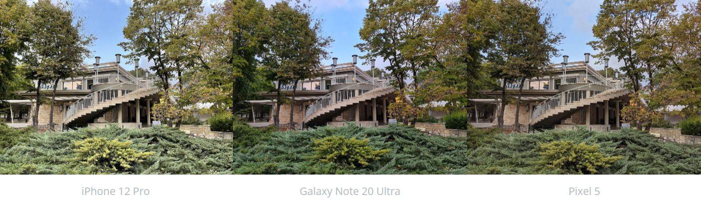 Trên ảnh của iPhone 12 Pro, bạn nhận thấy độ phơi sáng tốt hơn so với Galaxy Note 20 Ultra, nhưng nếu so sánh với Pixel 5 thì đứa con của Google đã tạo ra ảnh có cân bằng trắng tốt và trông đẹp hơn một chút.
