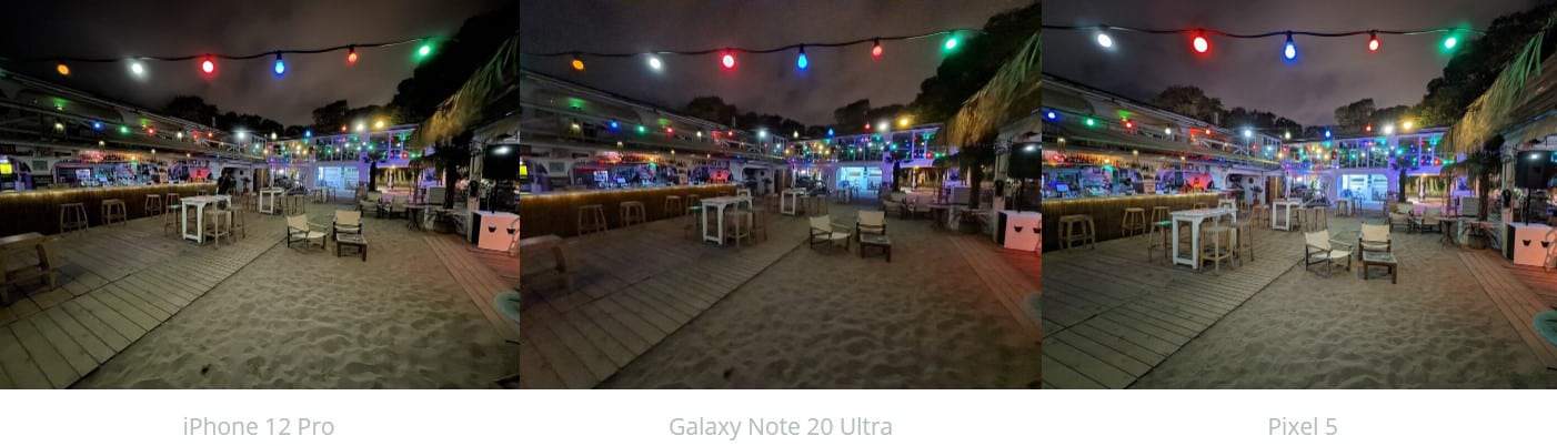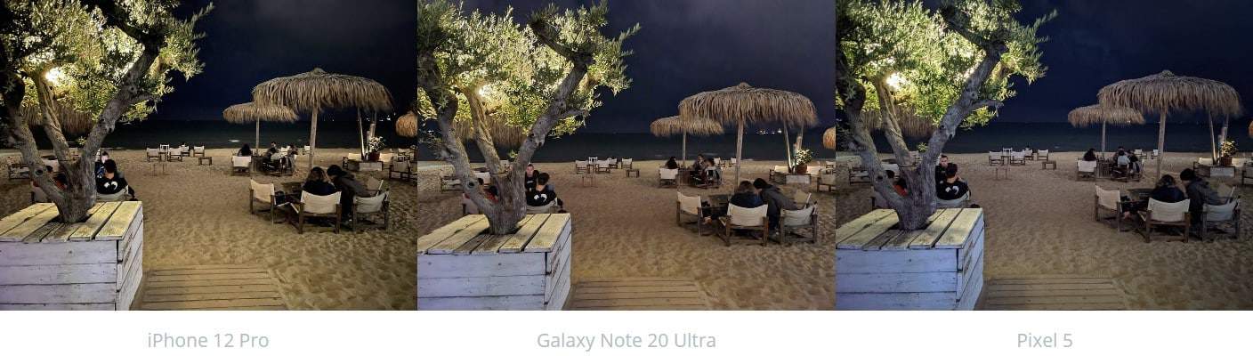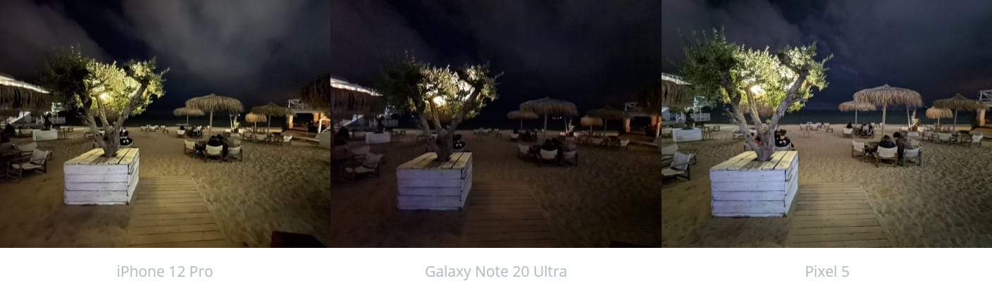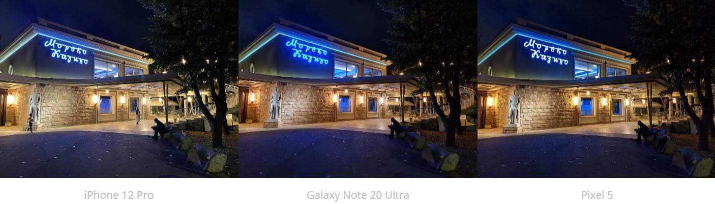Chuyển sang camera siêu rộng, iPhone 12 Pro giờ đây cũng có thể sử dụng Chế độ ban đêm (Night Mode) bằng ống kính này. Tất cả các ảnh đều được chụp bằng cài đặt tự động. Ảnh từ Note 20 Ultra trông khá tối. iPhone và Pixel lại có một diện mạo khác: tông màu ấm hơn trên iPhone so với tông màu lạnh hơn và trung thực hơn trên Pixel.
