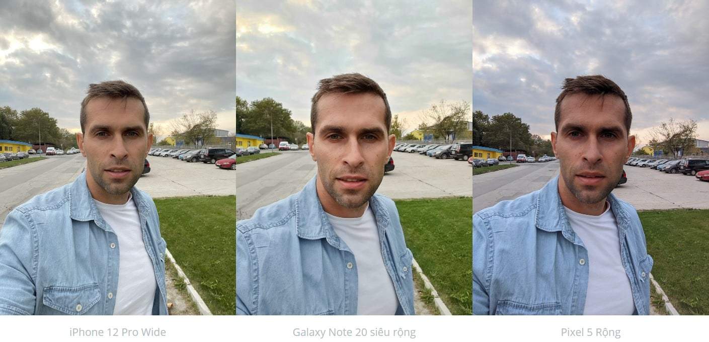 Ngoài ra, cả ba điện thoại cũng hỗ trợ chế độ chụp ảnh selfie góc rộng có thể phù hợp với một nhóm người đông hơn. Tóm lại, vấn đề tương tự với tông màu da bí ngô vẫn tồn tại trên iPhone, ảnh chụp tối tăm và ủ rũ trên Pixel, trong khi Galaxy có nền kém ấn tượng với ít hiệu ứng HDR bù lại khuôn mặt được phơi sáng tốt, đó là điều quan trọng trong một bức ảnh selfie.