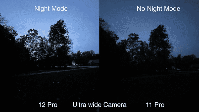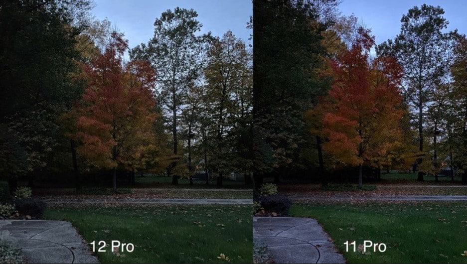 Trong điều kiện ánh sáng yếu hơn, có nhiều cải tiến đáng chú ý hơn trong ảnh chụp từ iPhone 12 Pro, một lần nữa nhờ vào chip A14 và máy quét LiDAR. Ảnh chụp ở chế độ Night Mode chụp được nhiều chi tiết hơn, sắc nét hơn và sống động hơn một chút.
