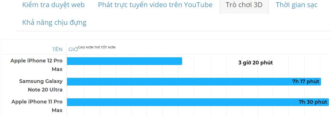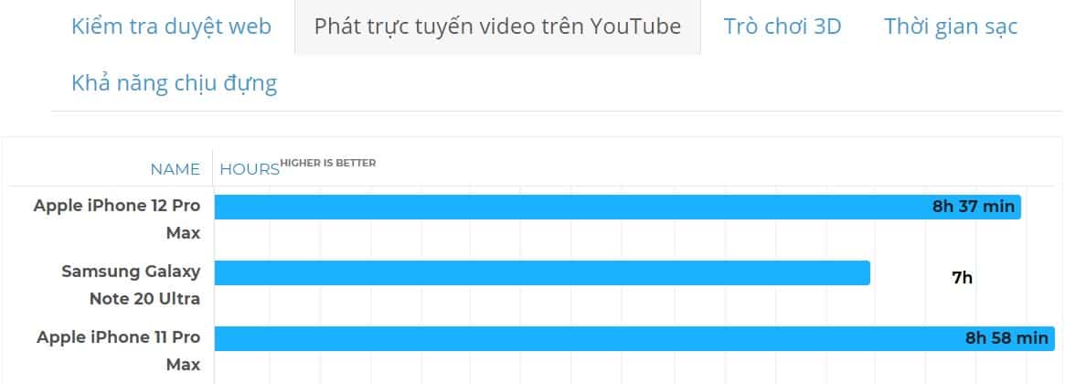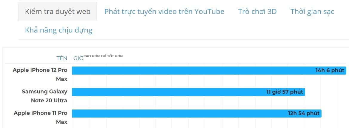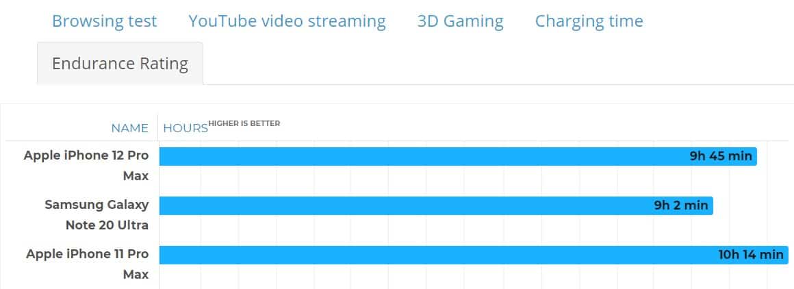 Theo Apple, thời lượng pin của Pro Max giống hệt với iPhone 11 Pro Max của năm ngoái, nhưng các thử nghiệm của Phone Arena cho kết quả khác nhau, từ vượt qua trong bài kiểm tra duyệt web đến thất bại thảm hại khi chơi game 3D với một số tựa. Ở thử nghiệm duyệt web, không cần phải nói, vì được thực hiện ở tốc độ làm mới màn hình 60Hz nên đã mang lại lợi thế về sức mạnh trước đối thủ có tốc độ làm mới cao như Note 20 Ultra.