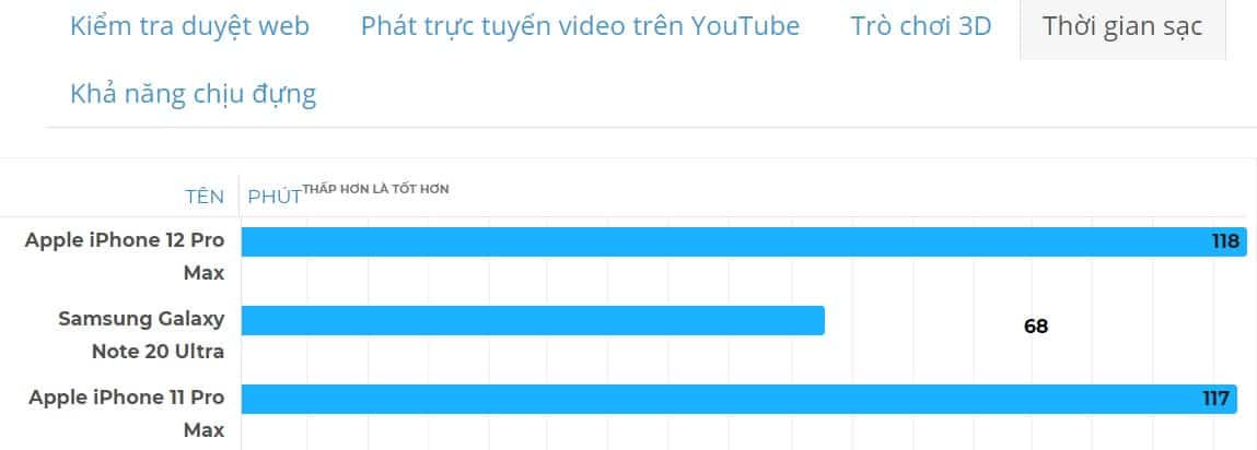 Tuy nhiên, khi nói đến khả năng sạc, Note 20 Ultra đánh bại 12 Pro Max hoàn toàn, nhanh hơn đến 50 phút. Chưa kể iPhone 12 mới thậm chí không đi kèm bộ sạc trong hộp, vì vậy bạn sẽ phải mua bộ sạc 20W của Apple, nếu không có bộ sạc 18W cũ hơn. Trong khi đó, Note 20 Ultra sẽ được đi kèm với bộ sạc 25W trong hộp.