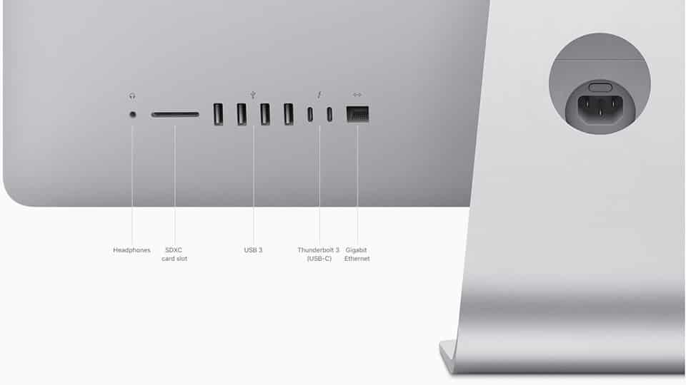Thế nhưng, iMac lại hoàn toàn khác biệt, thiết bị được trang bị rất nhiều cổng kết nối từ USB-A (3.0) cho đến USB-C (tương thích USB 3.1 gen 2 và Thunderbolt 3),bạn còn có những cổng kết nối cũ như là khe thẻ nhớ SD hoặc cổng Ethernet Gigabit. Thậm chí có cả cổng mạng RJ45 cho đường truyền internet ổn định.