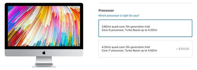Chiếc iMac 27 inch sẽ cơ bản trang bị bộ vi xử lý Intel Core i5 3.8GHz, tuy nhiên, nếu người dùng sẵn lòng bỏ thêm 200 USD sẽ được nâng lên con chip Intel Core i7 4.2GHz.