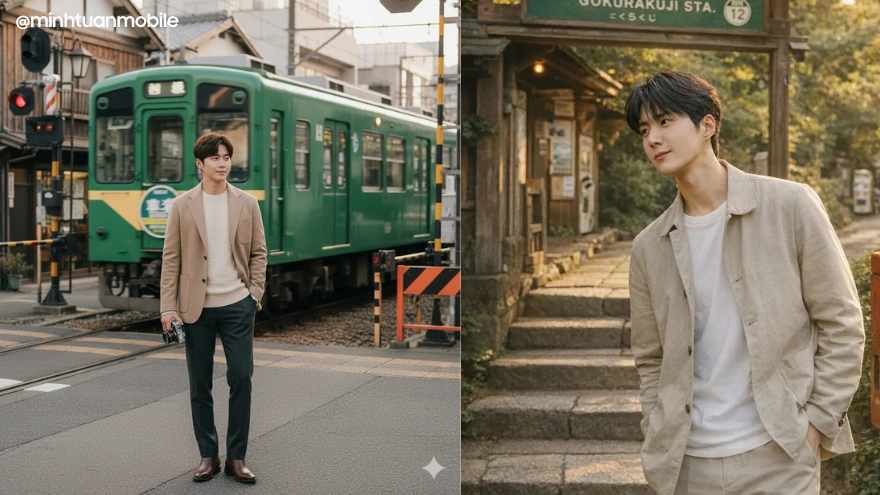Tạo ảnh check-in đường ray tàu Nhật Bản cực chill với Gemini AI, giữ trọn thần thái, ánh sáng tự nhiên, không cần đến Nhật.A candid street photography shot of a man standing beside a railway crossing near Tanaka Barbershop area, Kamakura, Japan. He is wearing a stylish autumn outfit — a neutral-toned jacket, knit inner layer, tailored trousers, and leather shoes. Create a photo of my original face and upload 100% of my face,the photograph boasts sharp 8K resolution. The man is casually holding a camera in his hand, looking slightly away from the lens as if waiting for the train to pass. A classic green Enoden train passes behind him, slightly motion-blurred, creating a dynamic scene.