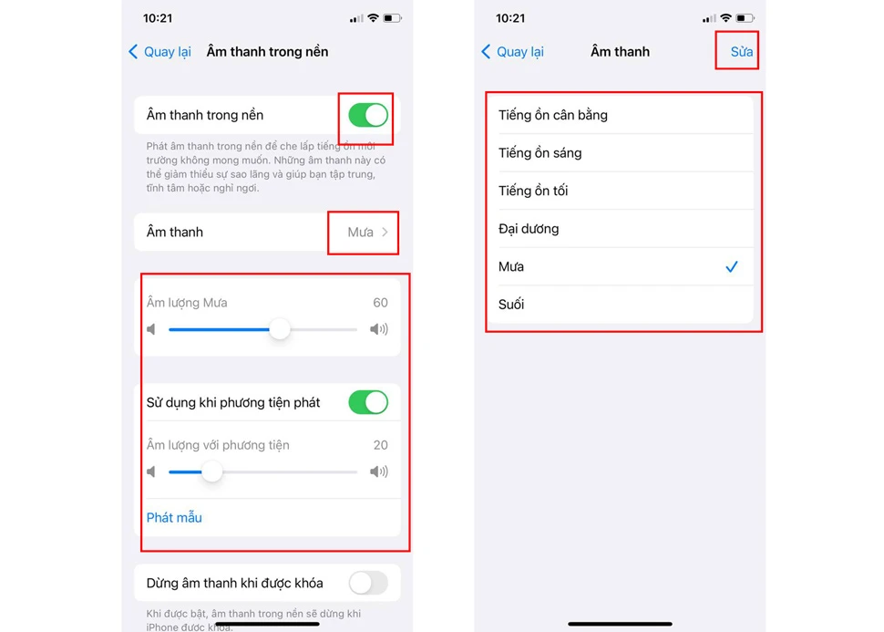 - Bước 3: Chọn một trong 6 âm thanh có sẵn: Tiếng ồn cân bằng, Tiếng ồn sáng, Tiếng ồn tối, Tiếng đại dương, Tiếng mưa và Tiếng suối > Điều chỉnh âm lượng theo ý muốn của bạn > Bạn cũng có thể cho phép âm thanh phát trong khi phương tiện khác đang phát.