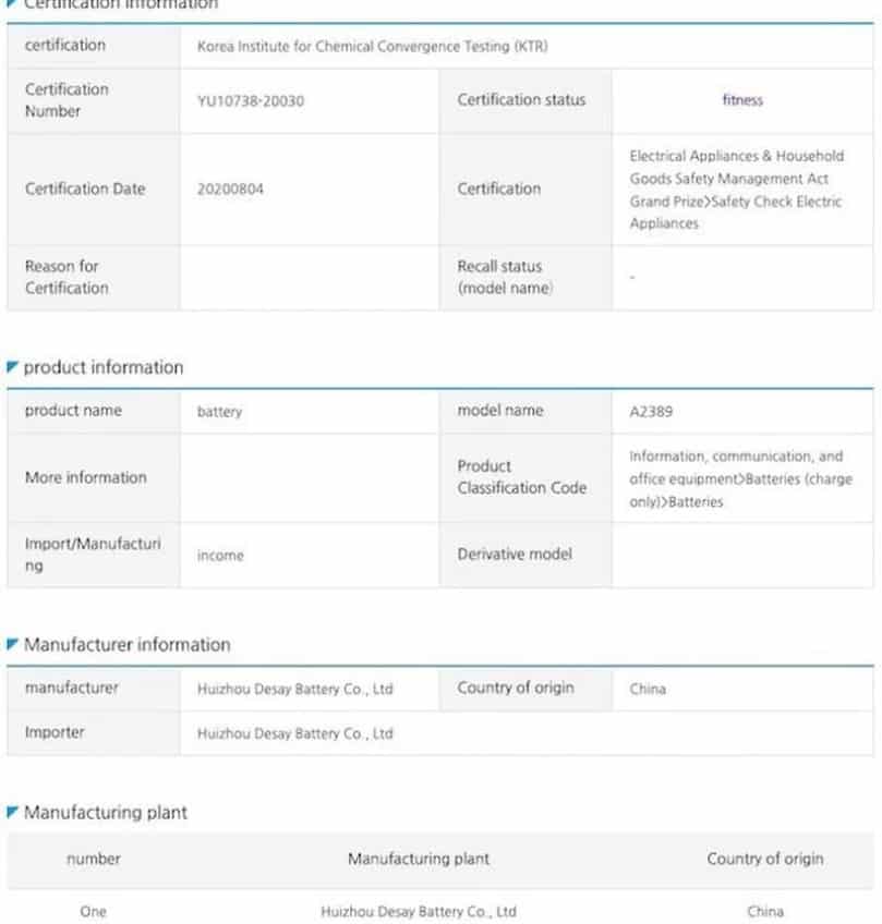 Theo đó, chứng nhận pin của MacBook Air mới có thể đã được nộp tại Trung Quốc và Đan Mạch gần đây. Mới đây, chứng nhận tương tự tiếp tục xuất hiện trên Chứng nhận An toàn Hàn Quốc, cùng với hình ảnh của pin.