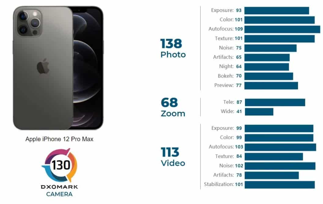 iPhone 12 Pro Max đạt 138 điểm khi chụp ảnh, 68 điểm cho khả năng zoom và 113 điểm khi quay video. Để so sánh, kết quả của iPhone 12 Pro tương ứng là 135, 66 và 112 điểm.